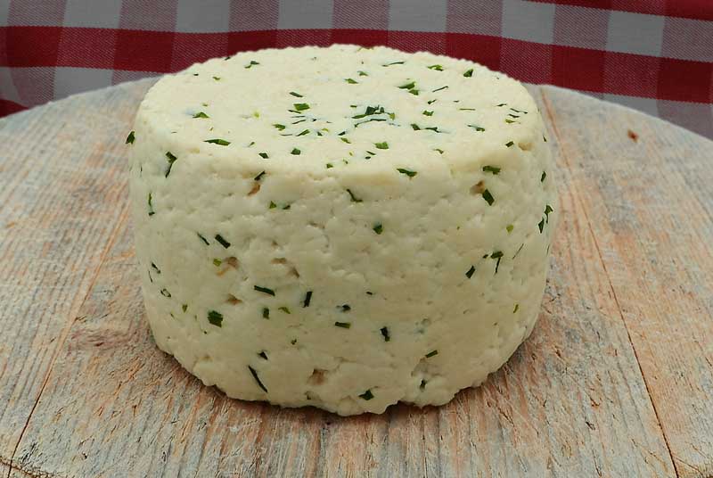 Formaggio fresco a latte termizzato, spezie varie di stagione (peperoncino, erba cipollina, rosmarino, rucola, noci, radicchio, peperoncino-prezzemolo-aglio), pasta compatta di colore bianco, sapore fresco e aromatico.